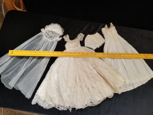 Title (ebay affiliate link): Antique Vintage Doll Fashion Full Lace Wedding Gown Dress Tulle Veil Slip 20" NR