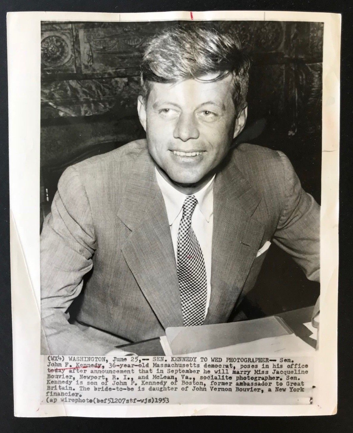 Title (ebay affiliate link): John F. Kennedy JFK 1953 engaged Jackie Bouvier original news wire press photo