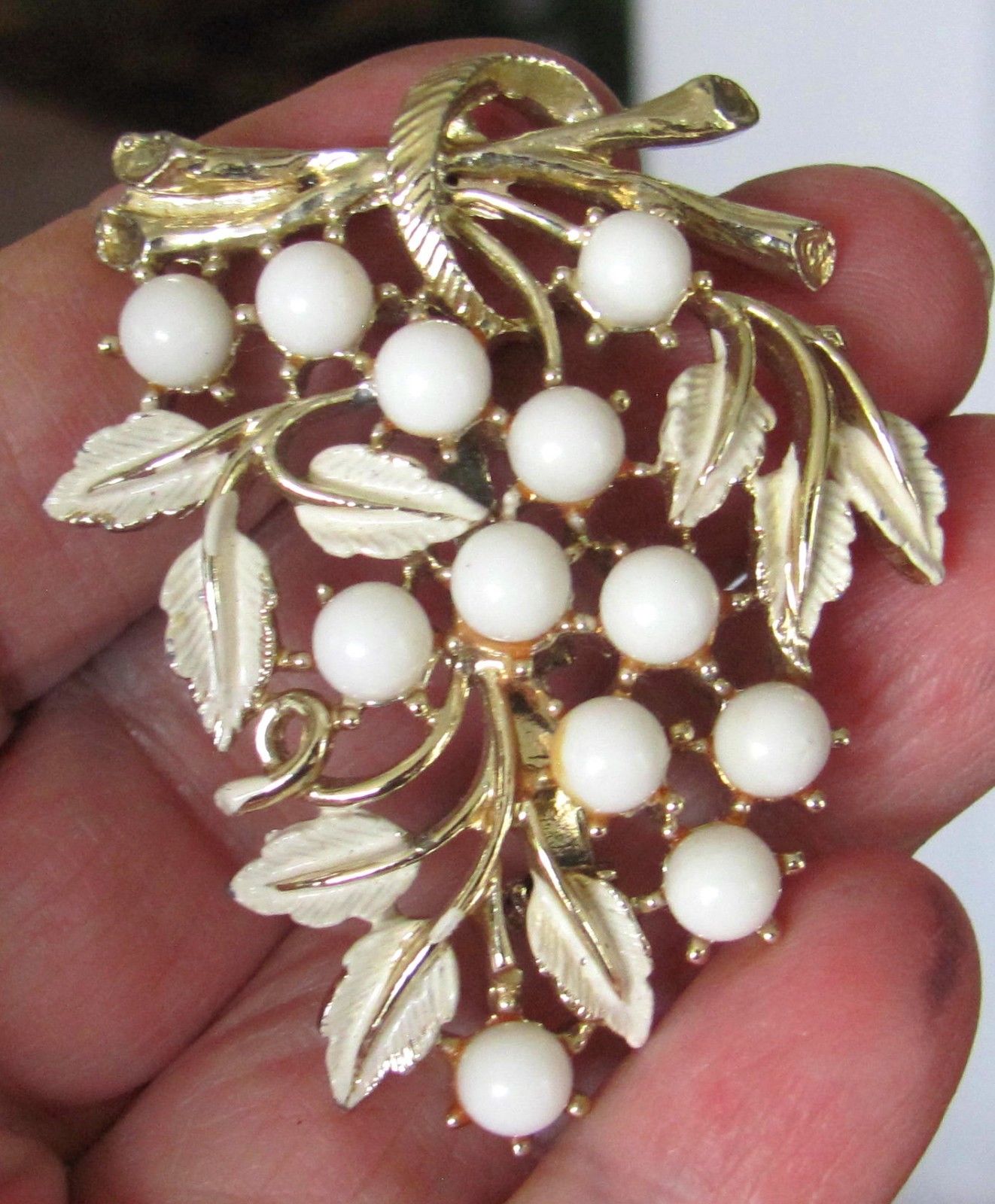 Title (ebay affiliate link): Vintage Gold tone White Enamel Leaves Milk Glass Cluster Beaded Brooch