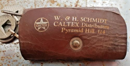 Vintage CALTEX leather wallet keyring with old FORD keys.