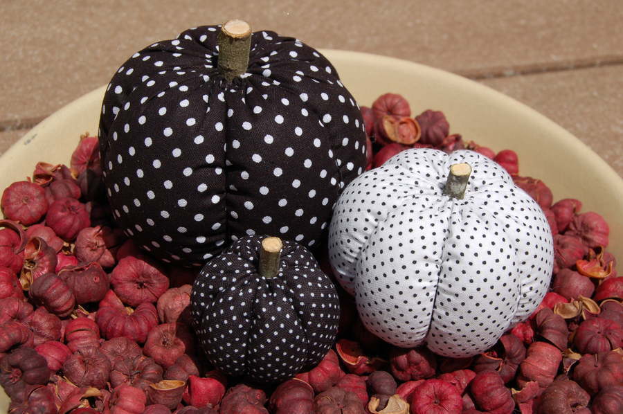 Title (ebay affiliate link): Primitive Fall Halloween Black & White Polka Dot Pumpkin Ornies, 3 Diff Prints