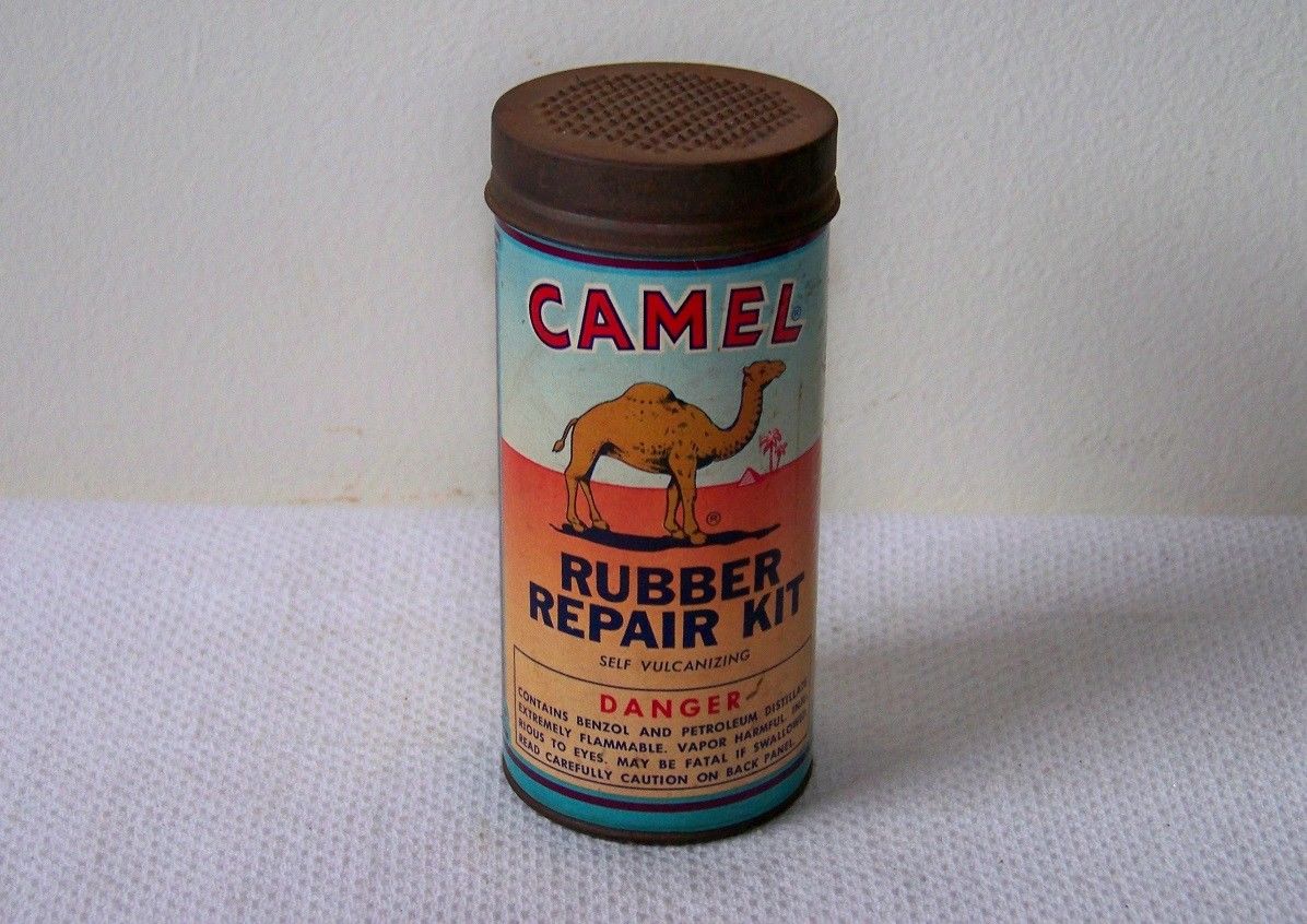 Title (ebay affiliate link): Vintage CAMEL Self Vulcanizing RUBBER REPAIR KIT Advertising Tin Can (empty)