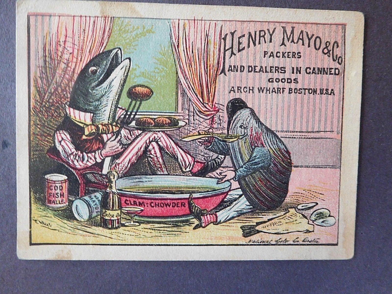 HENRY MAYO Co. Arch Wharf Boston MA OYSTERS CLAMS FISH TIN PACKING TRADE CARD