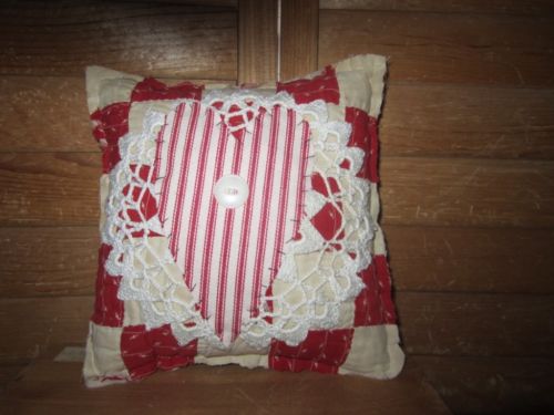 Title (ebay affiliate link): Primitive Quilted pillow -vintage red/white quilt - doily - red ticking heart