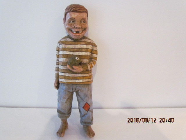 Title (ebay affiliate link): Vtg Funny 8" x 3" Painted Hand Carved Wood Folk Art Mischievous MissingTeeth Boy