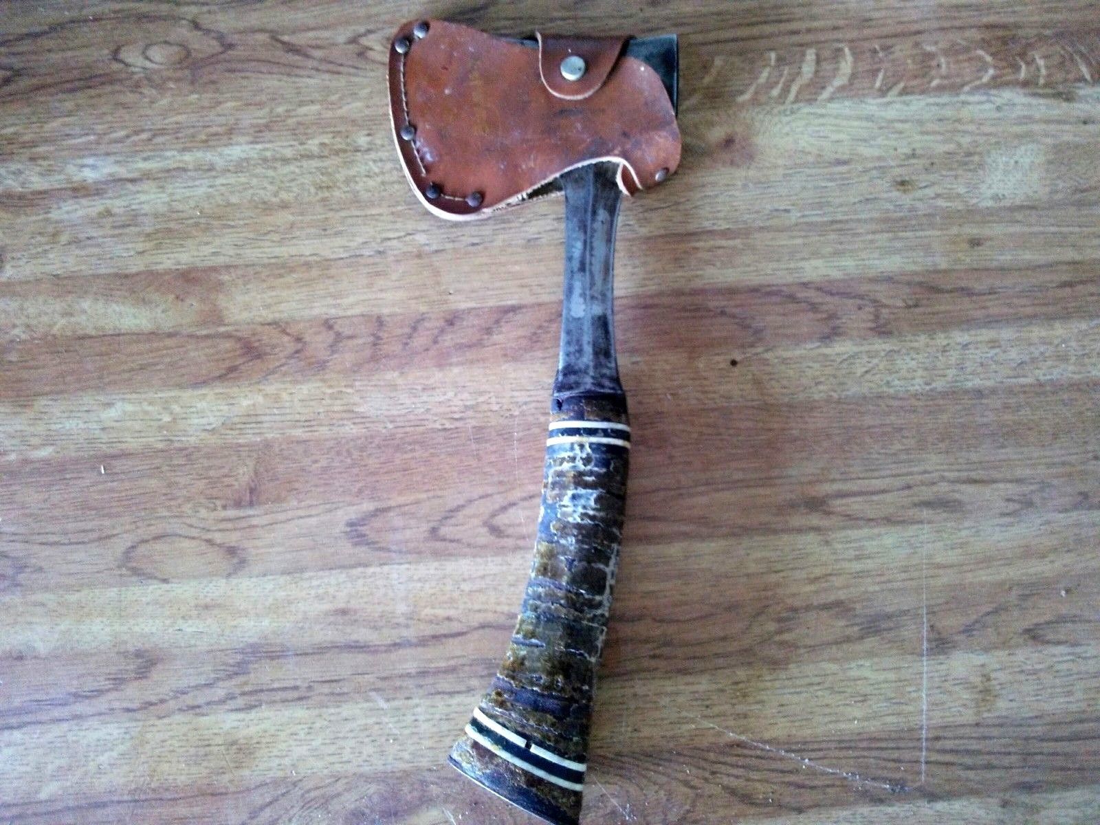 Title (ebay affiliate link): Vintage Estwing Axe-Hatchet, Leather Sheath, & great sharpener