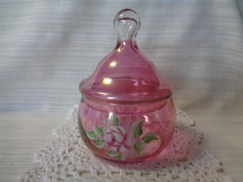 Title (ebay affiliate link): PINK GLASS CANDY JAR WITH LID - FLOWERS - PAINTED - ARTIST SIGN - 1991