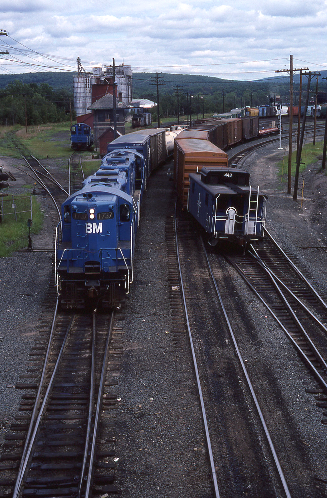 Boston & Maine GP9 # 1737 passes caboose # 443 @ E Deerfield, MA 8/11/1982