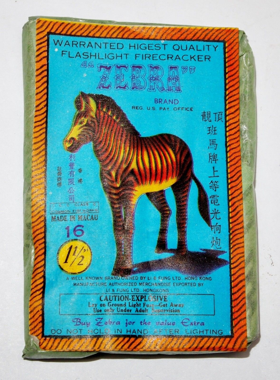 Title (ebay affiliate link): Vintage Zebra Brand Firecracker Label, 1 1/2", Macau, Green Pack, 16 Count