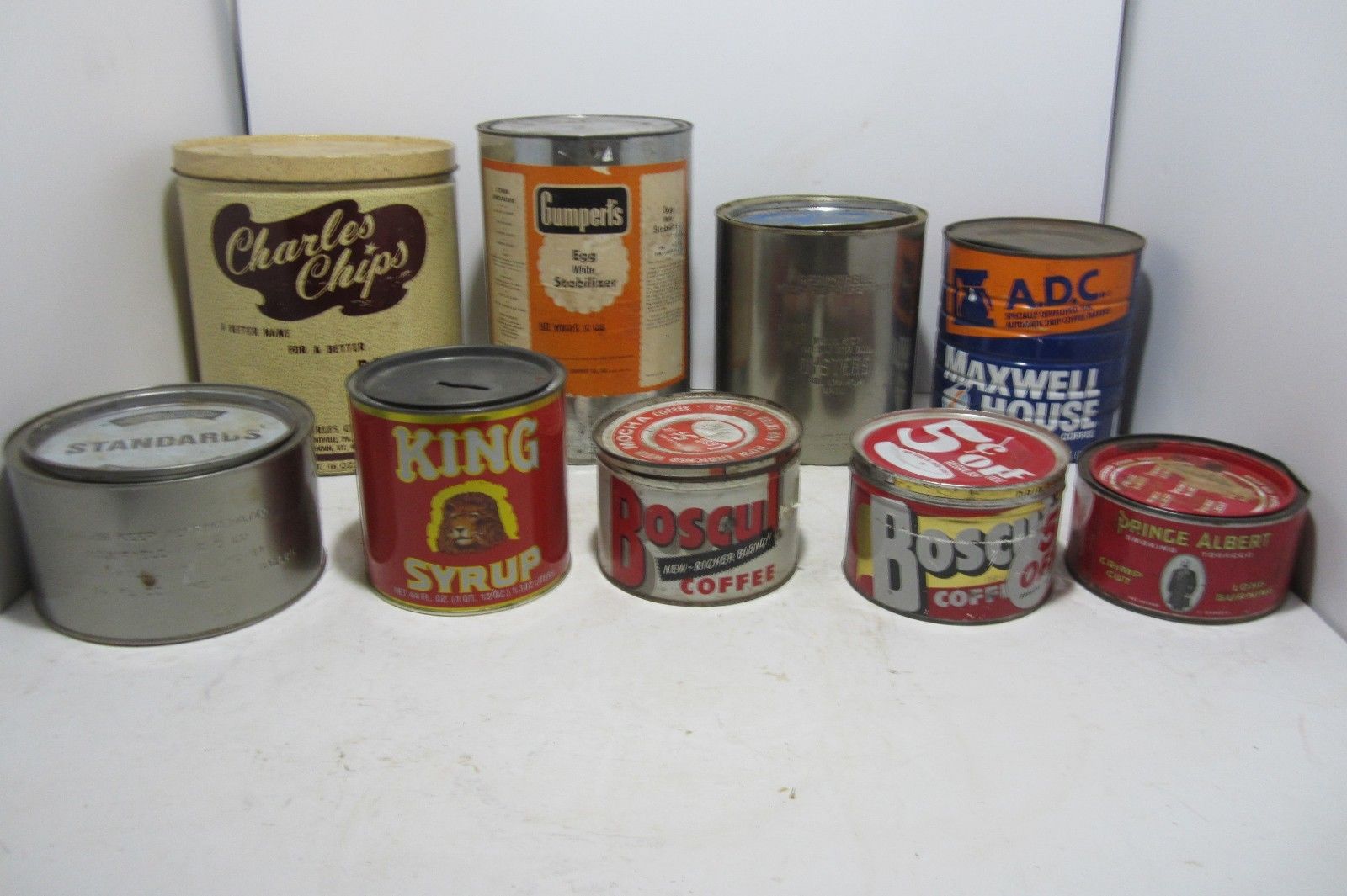 Title (ebay affiliate link): 9 Tins Metal Antique Boscul Oysters Maxwell House Gumpert''s Prince Albert Chips
