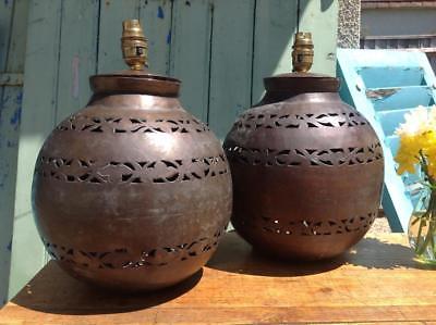 Vintage Indian Pierced Brass Drying Jars Converted To Lamps Pair x2 Rustic Chic