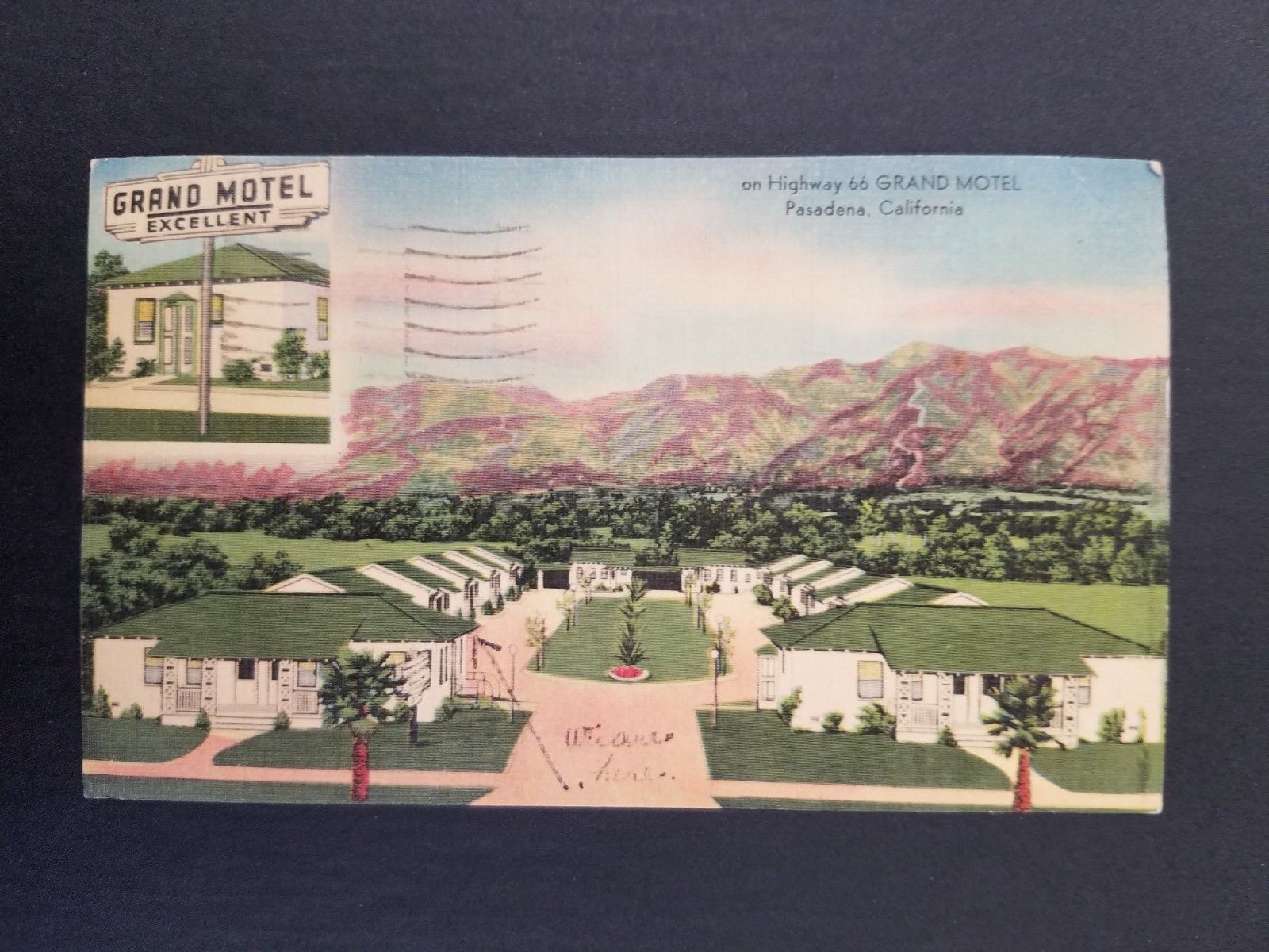Title (ebay affiliate link): Grand Motel on Highway 66, Pasadena, California Postcard ~ Linen ~ Posted 1941
