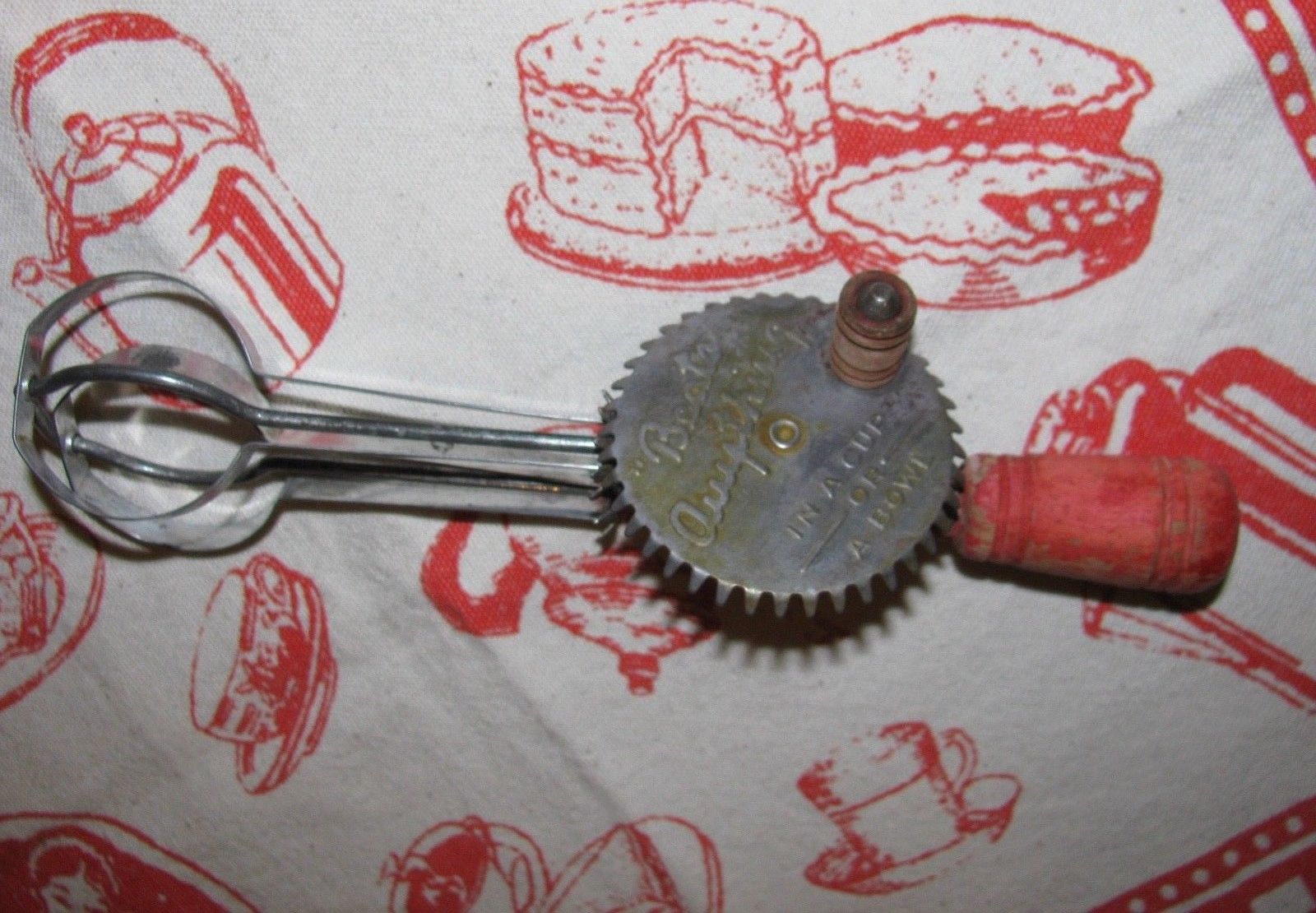 Title (ebay affiliate link): Vintage Red Wood Handle "BEATS ANYTHING IN A CUP OR A BOWL" 7.5" Egg Beater