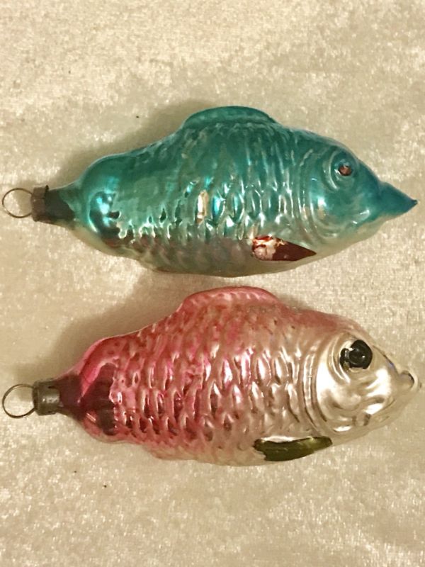 Title (ebay affiliate link): 2 ANTIQUE CHRISTMAS ORNAMENTS MERCURY GLASS BUMPY FISH RED GREEN