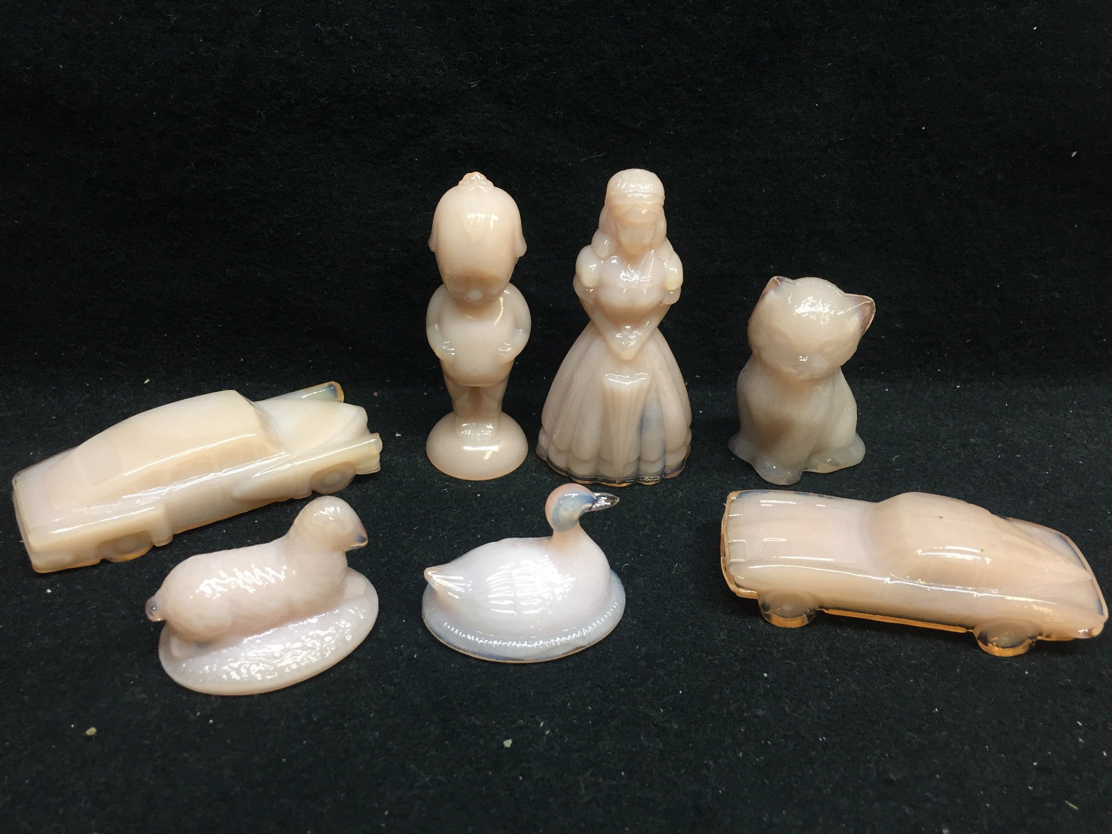 Crown Tuscan Pink Milk glass Kewpie Jennifer Doll tucker car 1963 corvette / cat