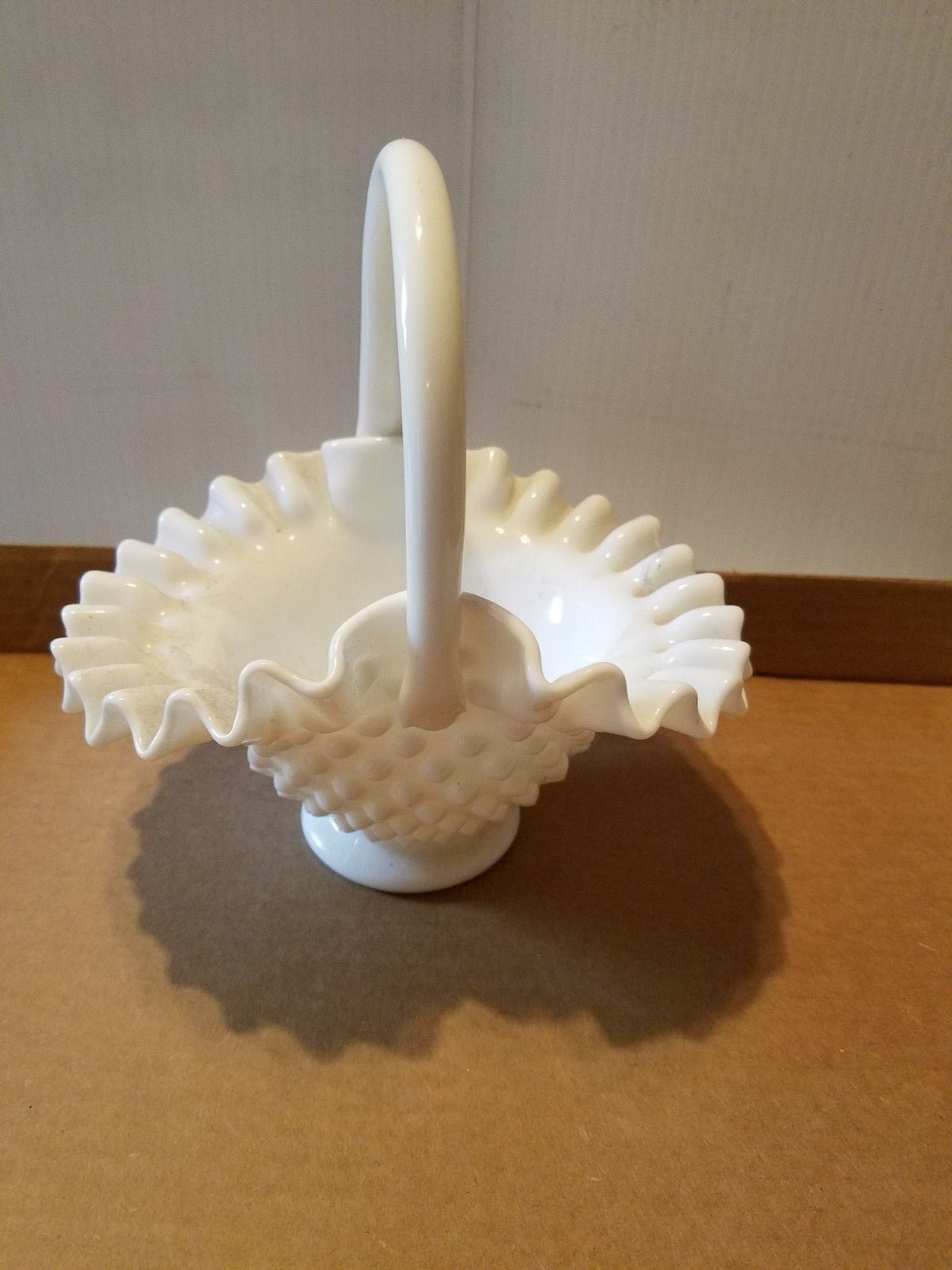 Title (ebay affiliate link): VINTAGE WHITE MILK GLASS HOBNAIL BASKET RUFFLED EDGE EXC COND.