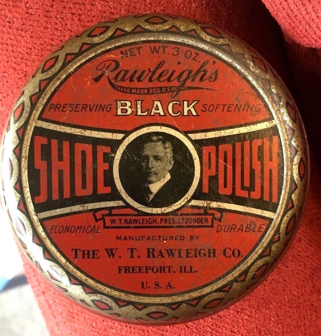 Title (ebay affiliate link): ANTIQUE VINTAGE SHOE POLISH TIN: HTF RAWLEIGH''S BLACK W/PHOTO LOGO, CONTENTS