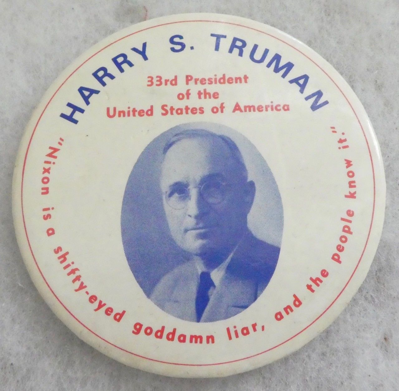 VINTAGE TRUMAN "NIXON IS A SHIFTY-EYED GODDAMN LIAR AND THE PEOPLE KNOWIT BUTTON