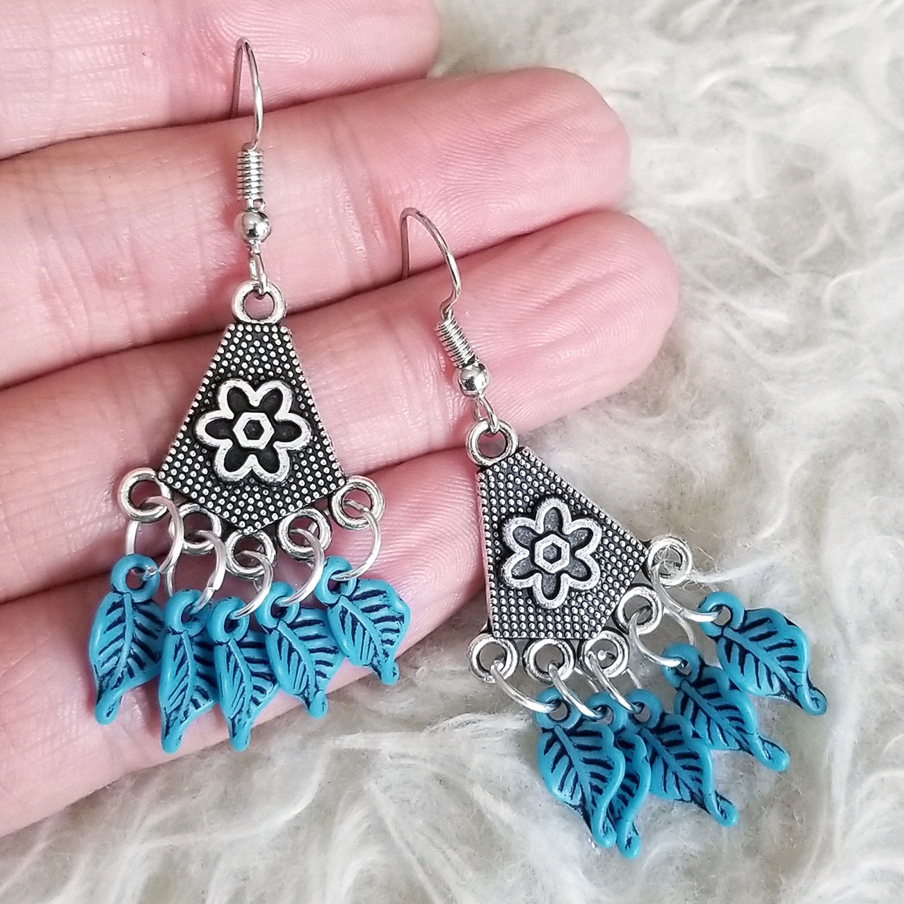 Title (ebay affiliate link): Womens Antique-Silver-Tone Plate Blue Plastic Leaves Dangle Drop Hook Earrings