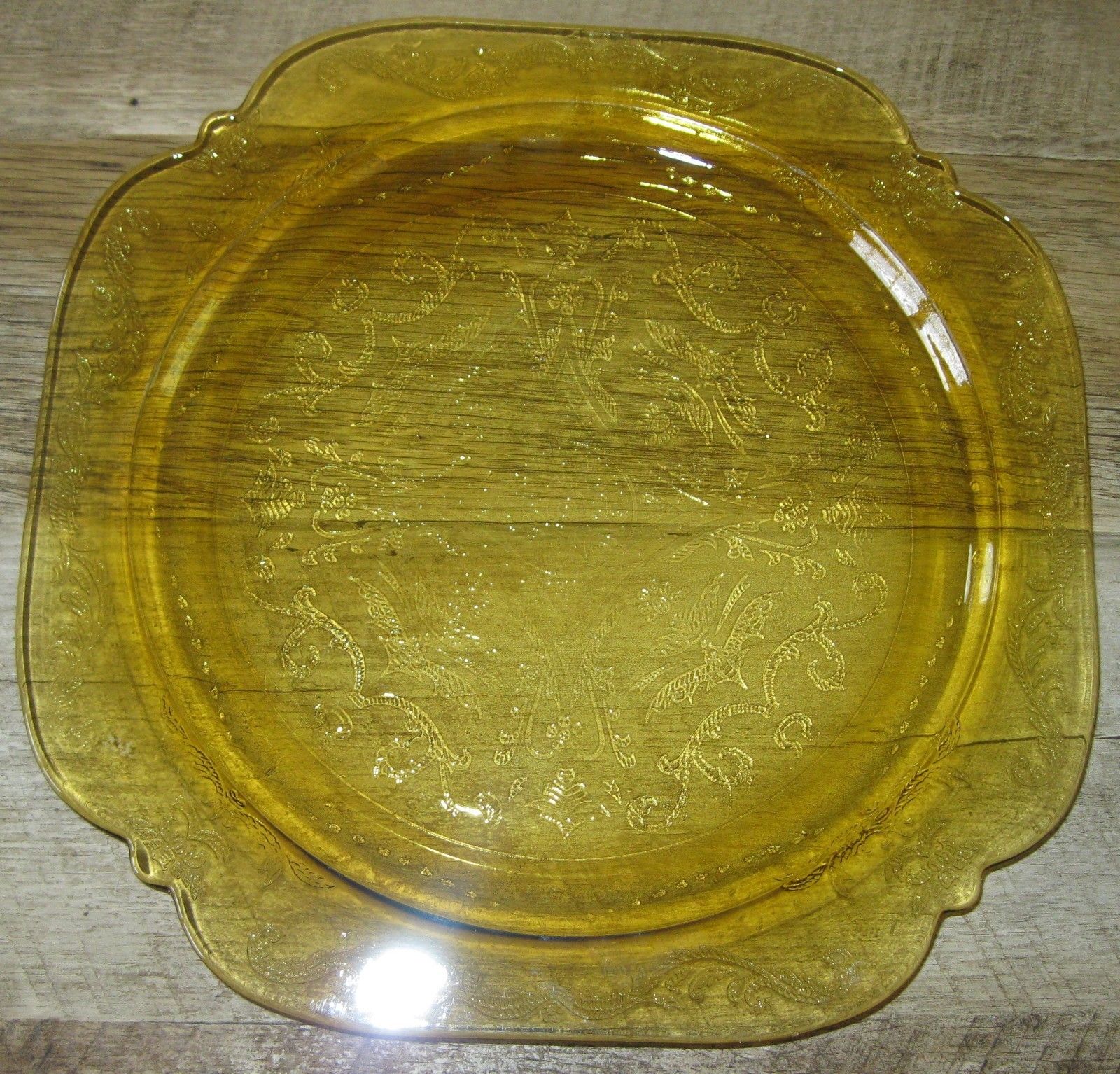 Title (ebay affiliate link): Vintage Depression Glass Amber Federal Madrid 10" square plate.Great condition.