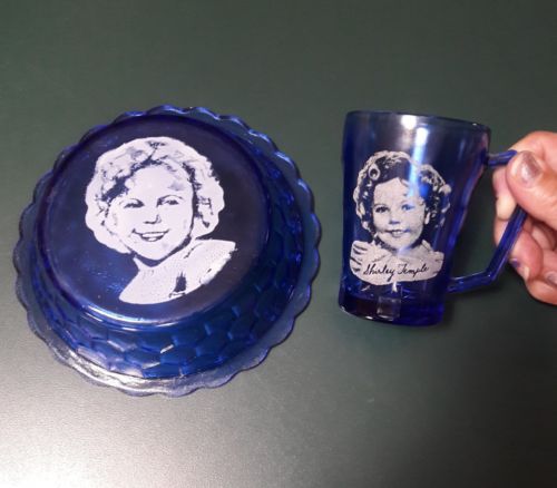 Title (ebay affiliate link): Vintage Cobalt Blue Depression Glass Bowl & Cup with Shirley Temple on it
