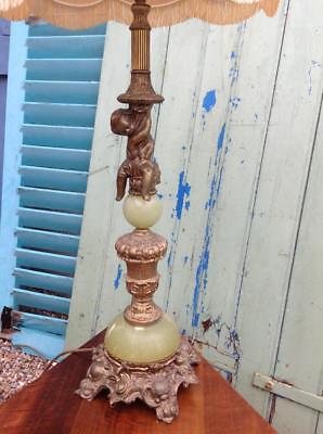 Large Vintage Green Onyx & Brass Cherub Table Lamp +Shade 87cm Hollywood Regency