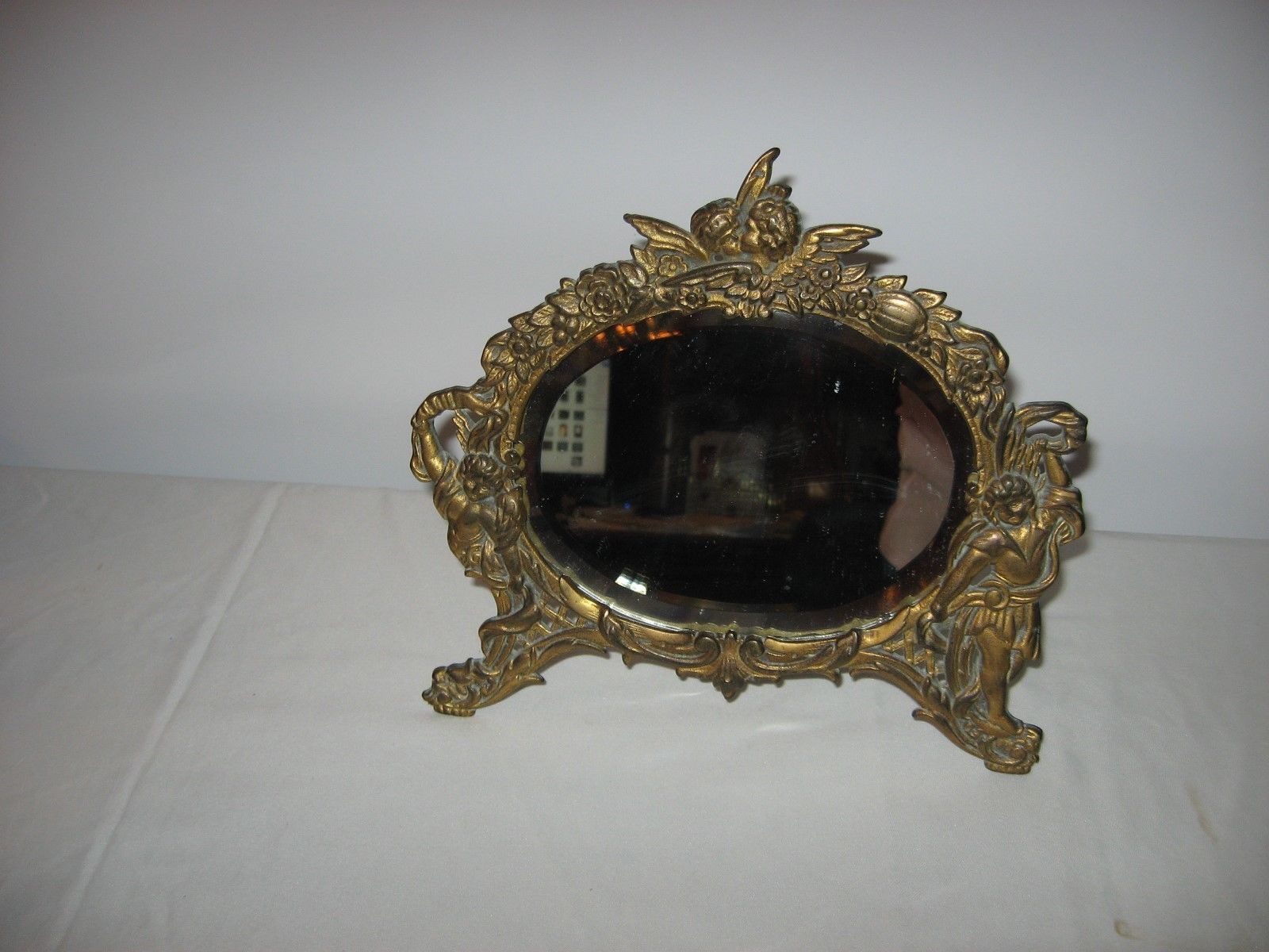 Title (ebay affiliate link): Vintage Antique Gold Metal Cherub Vanity Mirror Beveled Swing Arm Stand