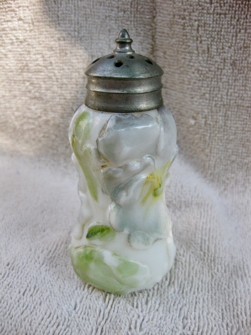 Victorian, Art Glass Salt Shaker, Milk Glass "Pansy Tall", Hand Painted, CA 1894