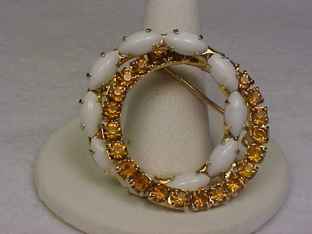 Title (ebay affiliate link): Vintage Goldtone & Milk Glass/Amber Rhinestone Double Circle Brooch