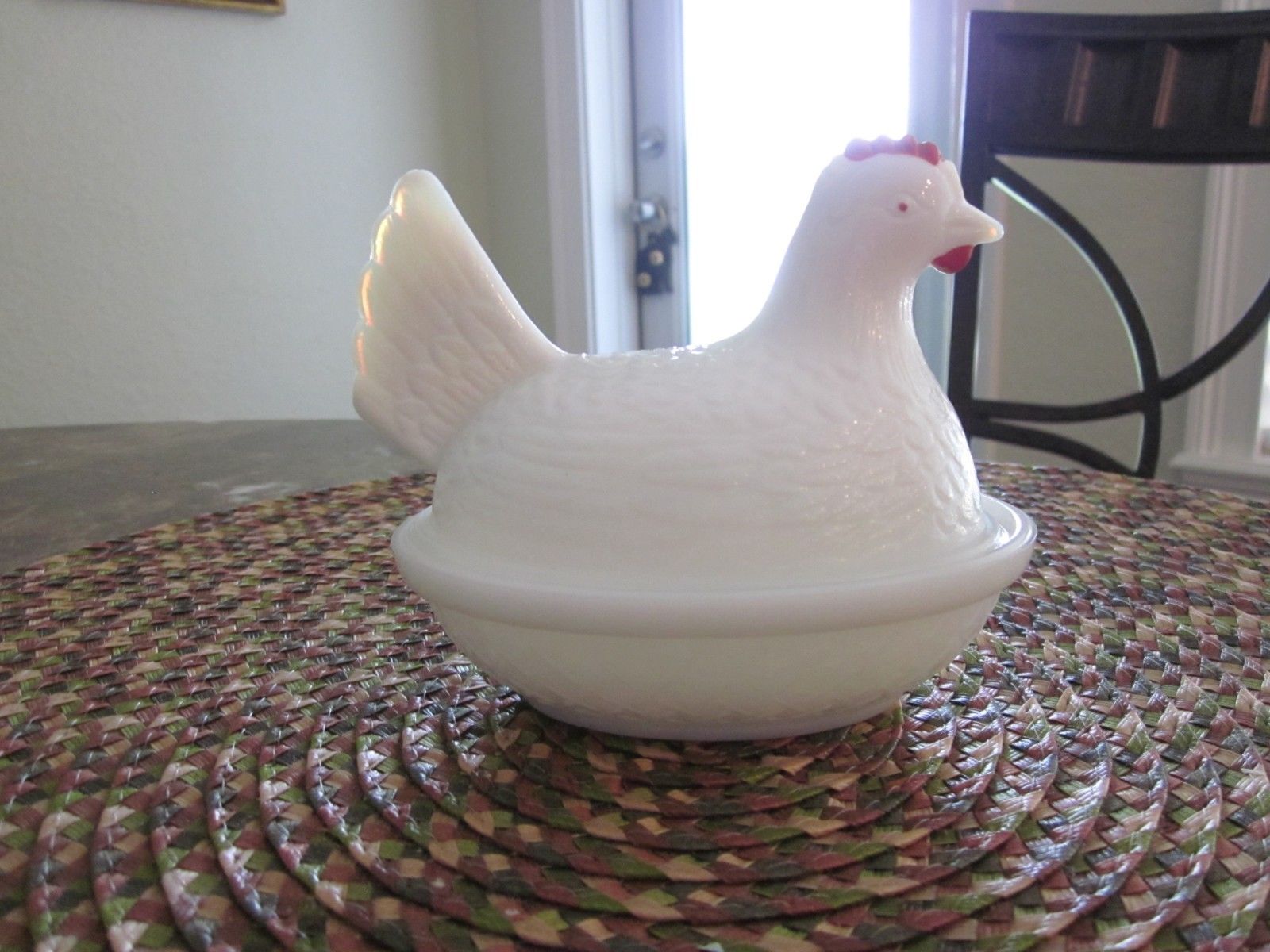 Vintage milkglass Hen on basket - - 4" high 4 `1/2" long