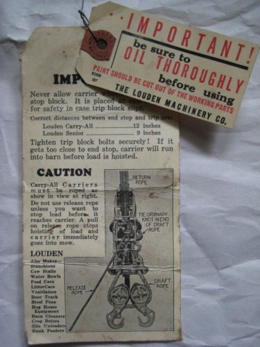 Title (ebay affiliate link): Original Louden Machinery Hay Trolley Product Tag, Information, Fairfield Iowa