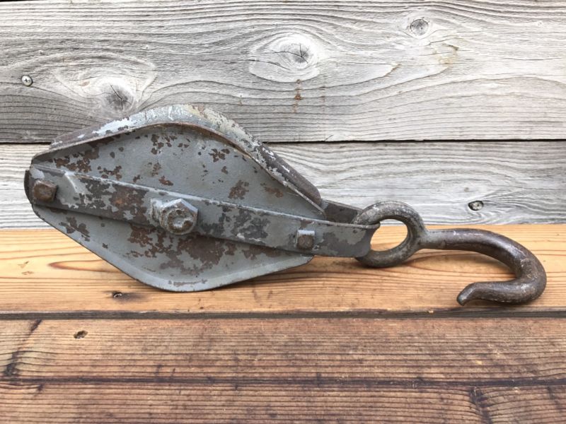 Title (ebay affiliate link): Large Vintage Cast Iron and Steel Pulley and Hook ~ Vintage Block and Tackle