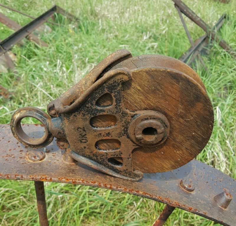 Vintage Cast Iron wood Barn Rope Pulley hay sling Rustic wheel Farm loft decor