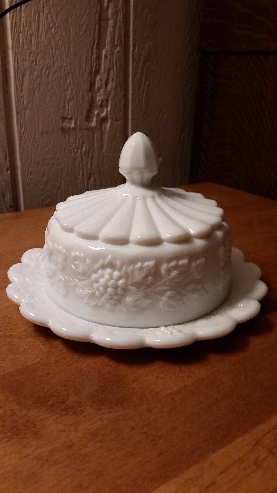 Title (ebay affiliate link): WESTMORELAND GLASS PANELED GRAPE MILK GLASS CHEESE or BUTTER DISH & COVER!