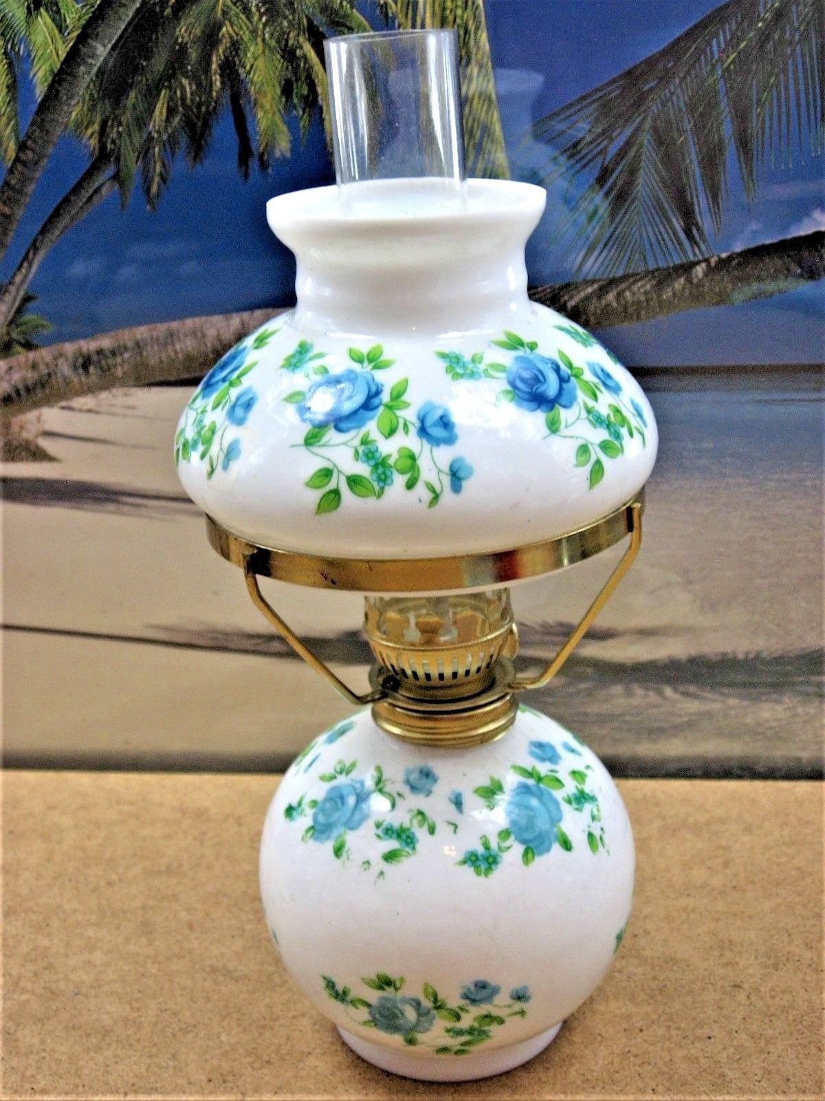 Title (ebay affiliate link): MINIATURE OIL LAMP WHITE MILK GLASS WITH BLUE ROSES MATCHING SHADE AND CHIMNEY