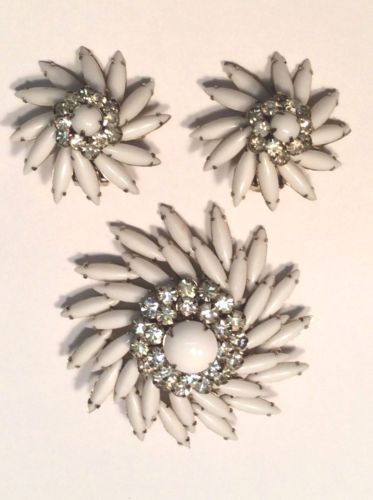 Title (ebay affiliate link): Vtg JUDY LEE Milk Glass Beads Clear Rhinestones Pin Brooch and Clip On Earrings
