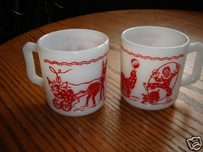 Vintage Milk Glass Children's Mugs w/Clowns Hazel Atlas