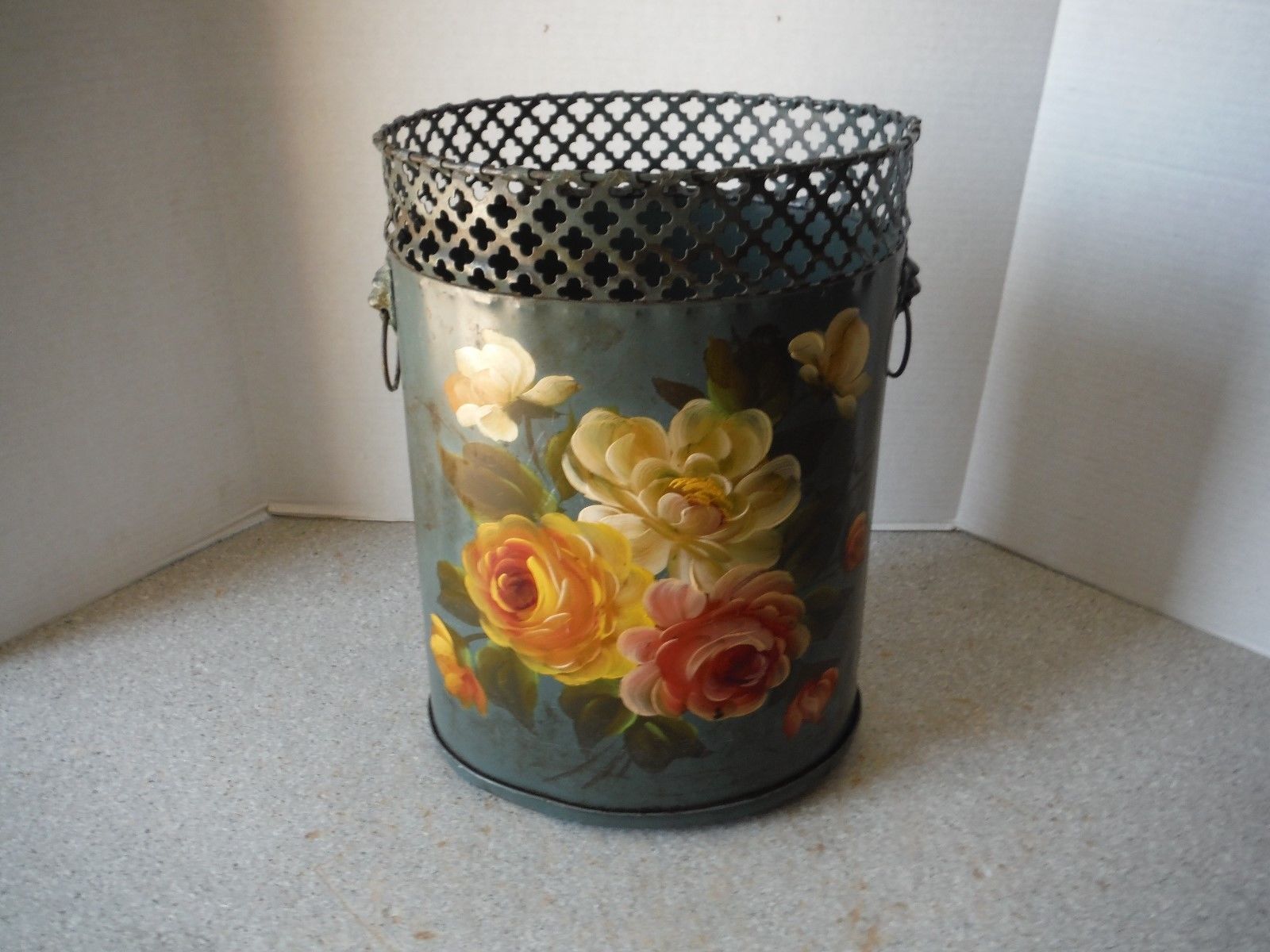 Title (ebay affiliate link): Antique Metal Waste Basket with Lion Heads Handles & Hand Painted Florals Design