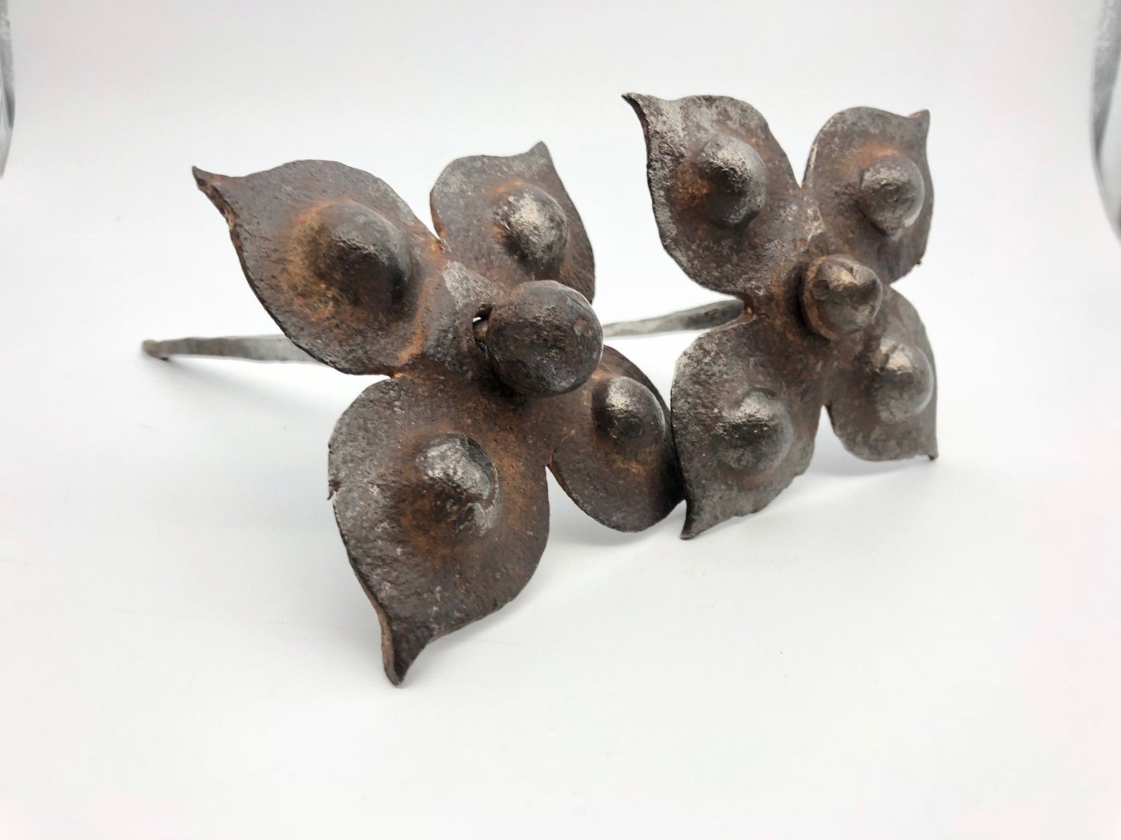 Title (ebay affiliate link): Pair Antique Primitive Blacksmith Hand Forged Iron Spike Pickets with Rosettes