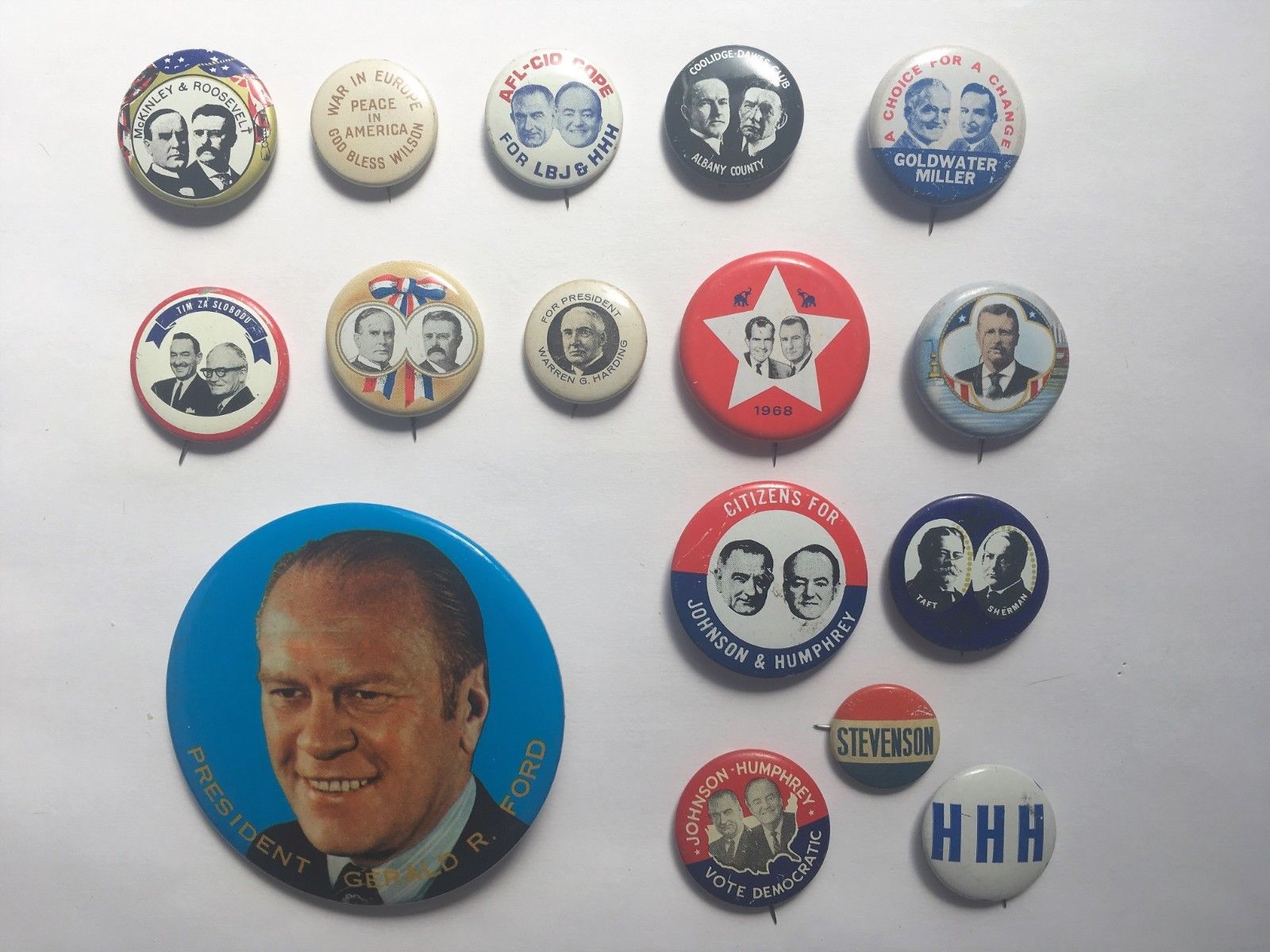 16 presidential election buttons. Ford, Johnson, Harding, Wilson, Roosevelt, etc