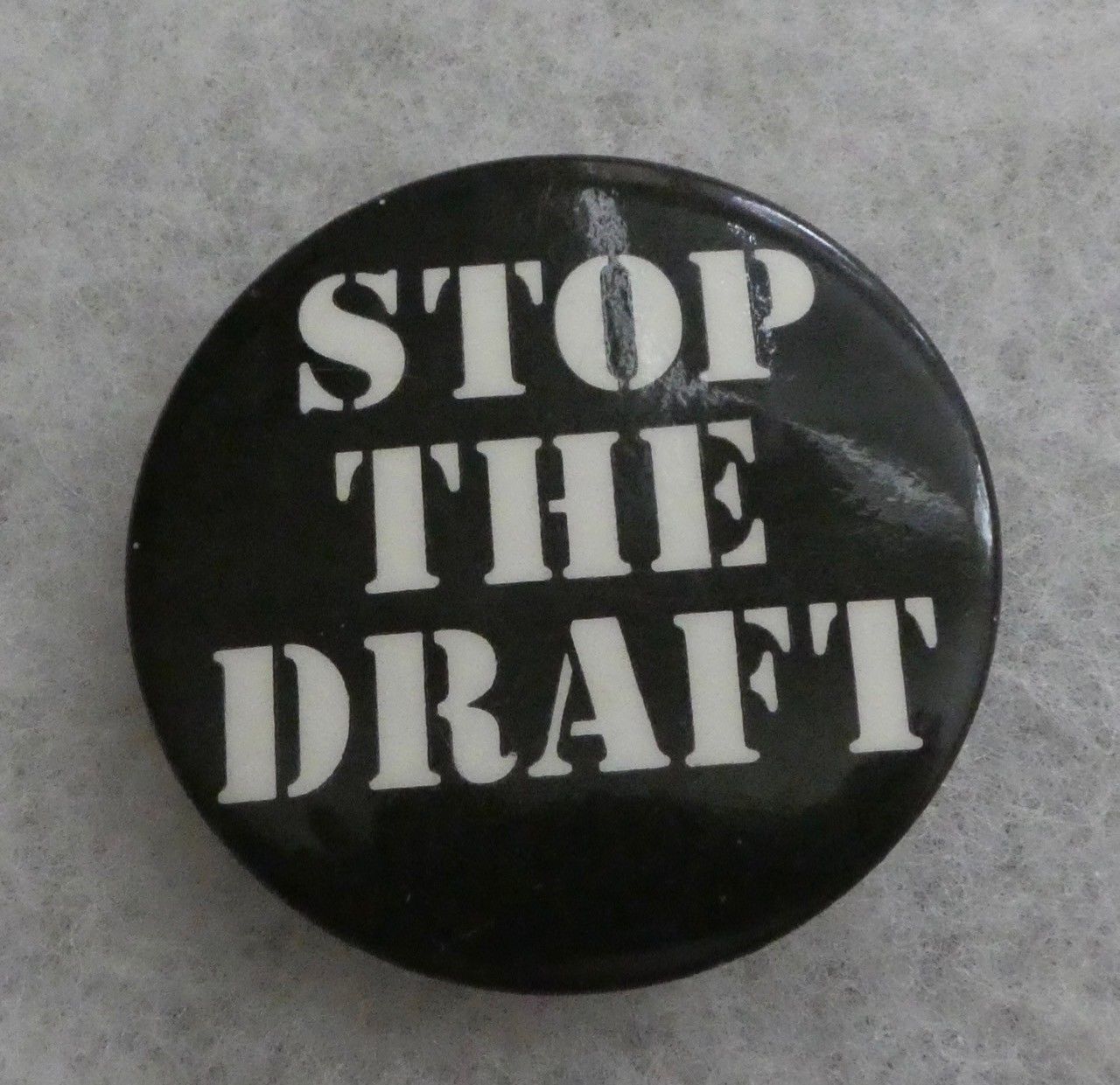 Title (ebay affiliate link): VINTAGE 1970 "STOP THE DRAFT" WHITE ON BLACK BUTTON