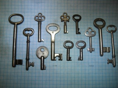 LOT OF 12 ANTIQUE SKELETON, FURNITURE, BARREL, CABINET AND OLD LOCK KEYS