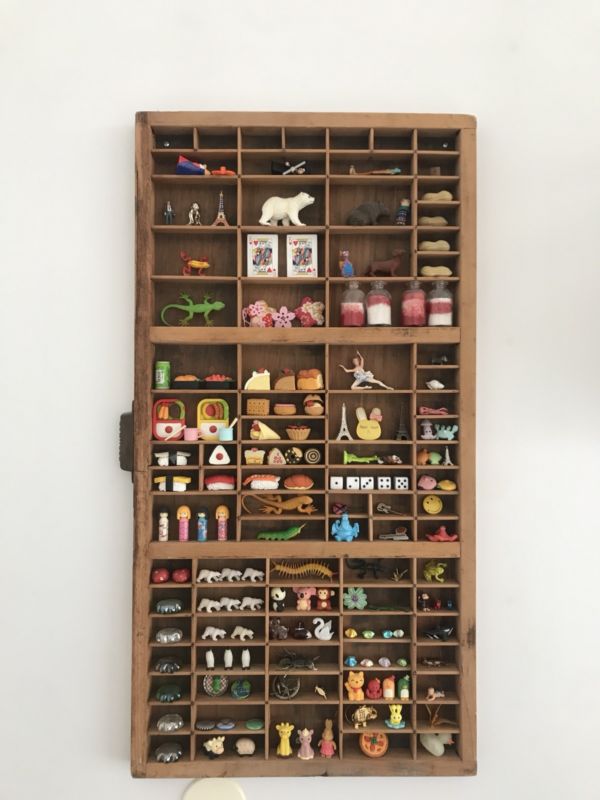 Title (ebay affiliate link): Antique Printers Typesetting Tray With Japanese Erasers And Knickknacks
