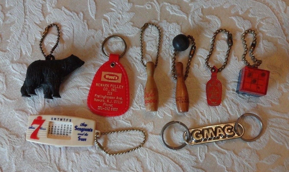 Title (ebay affiliate link): LOT VNTG KEY CHAINS - SEAGRAMS 7 - NEWARK PULLEY - GMAC - OLD DRUM - COTT - ETC