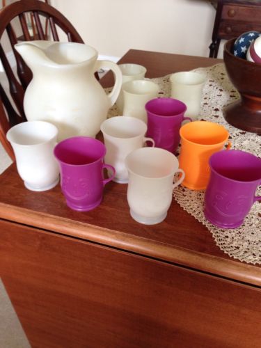 Title (ebay affiliate link): Vintage 1979 White Plastic Kool Aid Smiley Pitcher & 10 White/Purple/Orange Cups