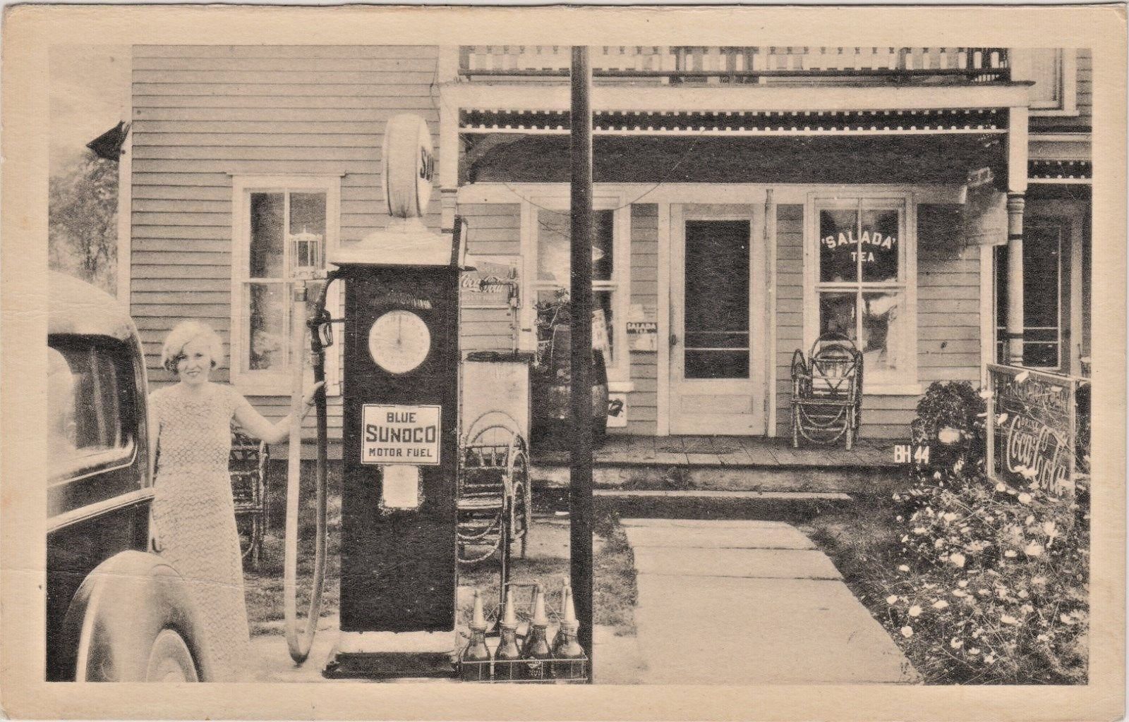 Young Lady by Blue Sunoco Gas Pump at General Store with Coca-Cola - Unique Card