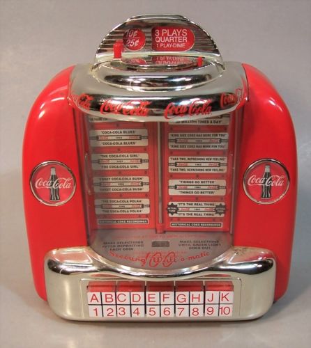 Title (ebay affiliate link): Enesco 1996 Coca Cola TABLETOP JUKEBOX Seeburg Wall-O-Matic Style Musical Bank