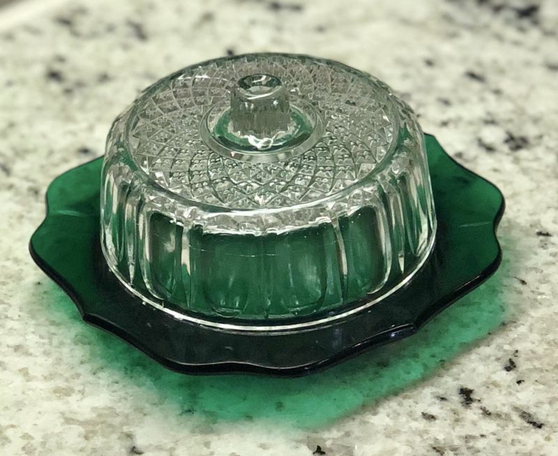 Title (ebay affiliate link): Vintage Forrest Green Square Butter Dish With Clear Diamond Lid Depression Glass
