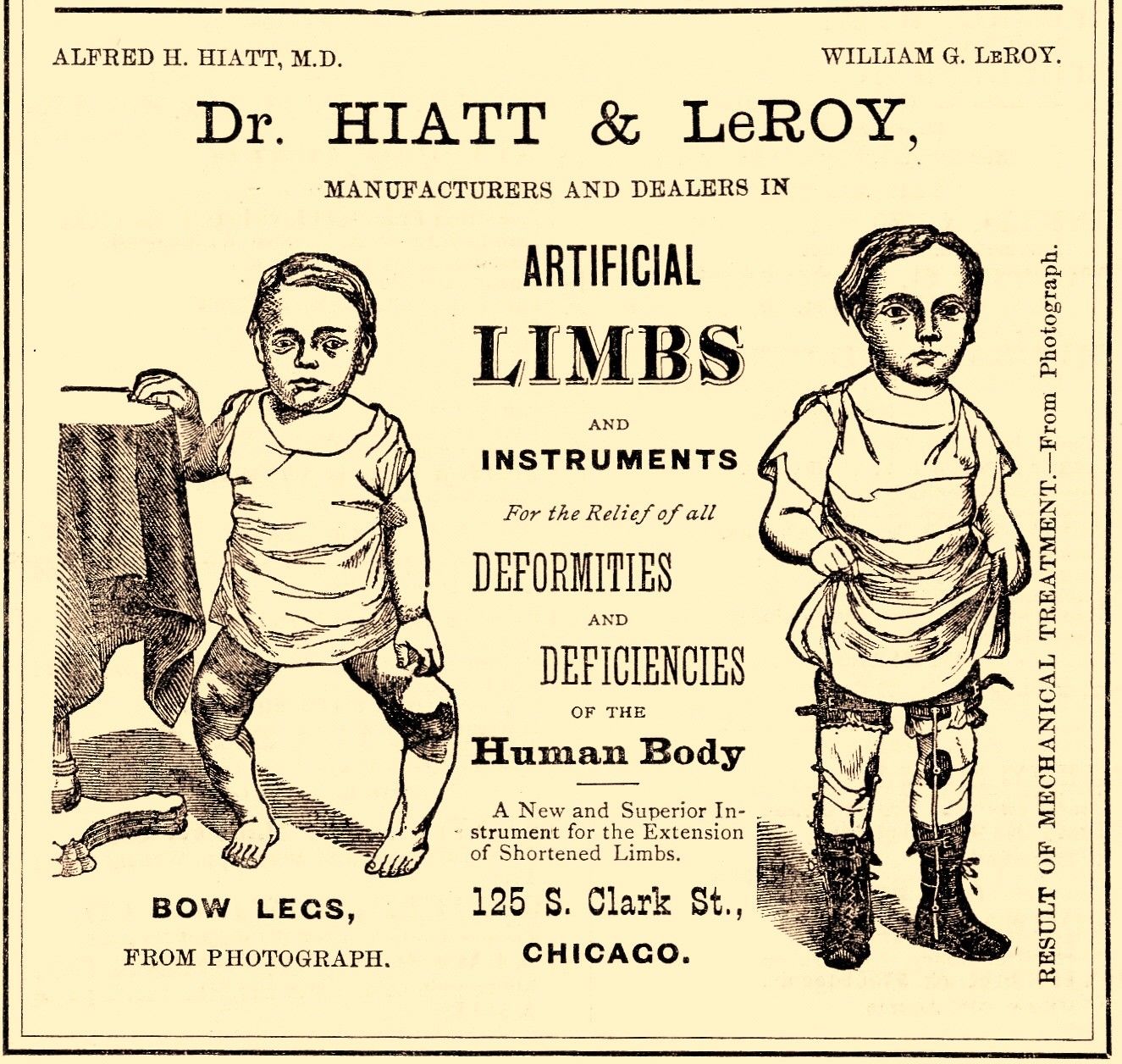 1874 DR. HIATT & LeROY MANUFACTURERS, CHICAGO, ILLINOIS ARTIFICIAL LIMBS AD