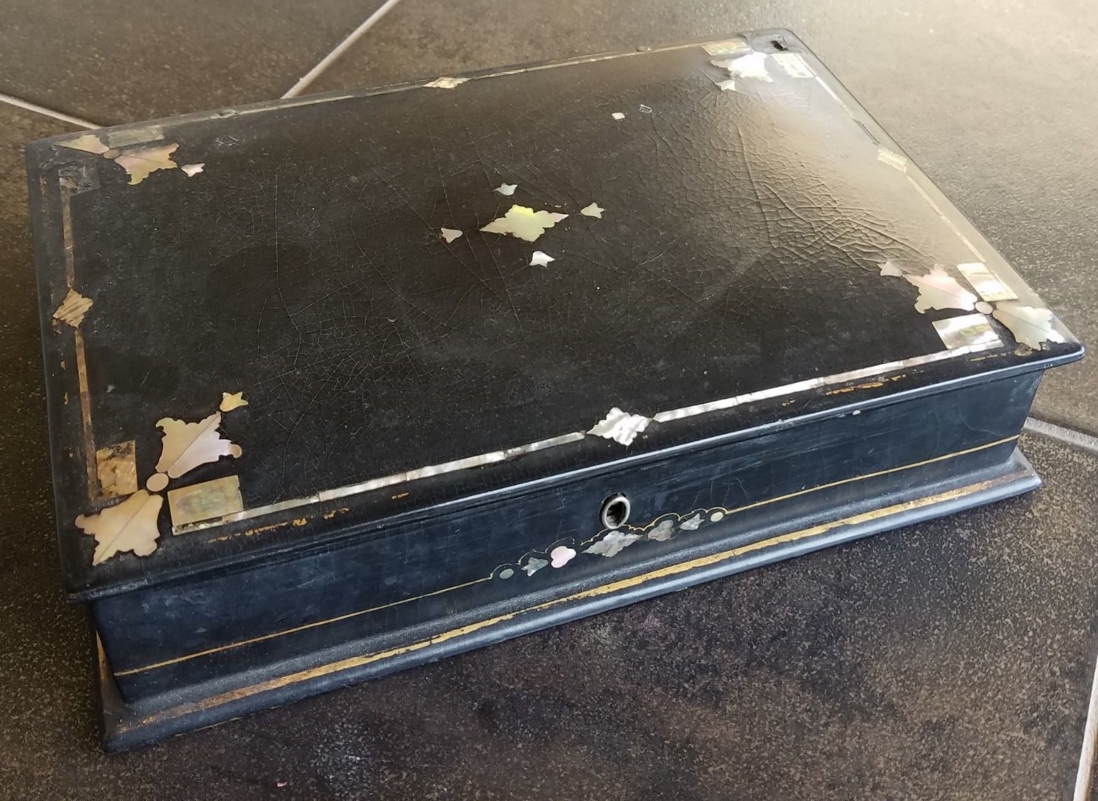 Title (ebay affiliate link): JENNENS & BETTRIDGE Antique Black Gold Papier Mache'' Jewelry Keepsake Box MOP